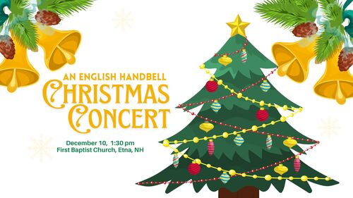 COMING Sunday, December 10 at 1:30 pm to the First Baptist Church, Etna, NH:  Joyful Bells, a two-octave English handbell ensemble, will be performing a concert of Christmas carols and seasonal music.  Free-will donations support camping programs at Camp Sentinel (celebrating its 75th anniversary this year).