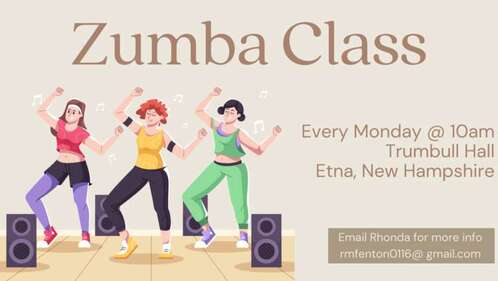 Zumba kickoff (dance-off?) for 2024: Rhonda Fenton will be offering a free Zumba class, open to all, on Monday January 1, 2024. Rhonda's hoping people will bring their family and friends and come to dance and have fun for an hour! Trumbull Hall at the Etna church, as usual, 10 AM. Don't miss this opportunity to give Zumba a try!