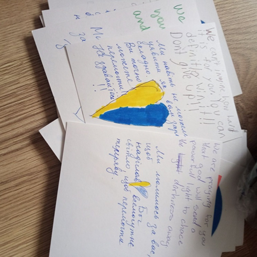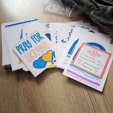 We have been so patiently waiting for the first batch of boxes that we shipped to Ukraine with stuffed socks, emergency silver blankets, and notes . We also sent cards in bulk for Ukrainians to distribute