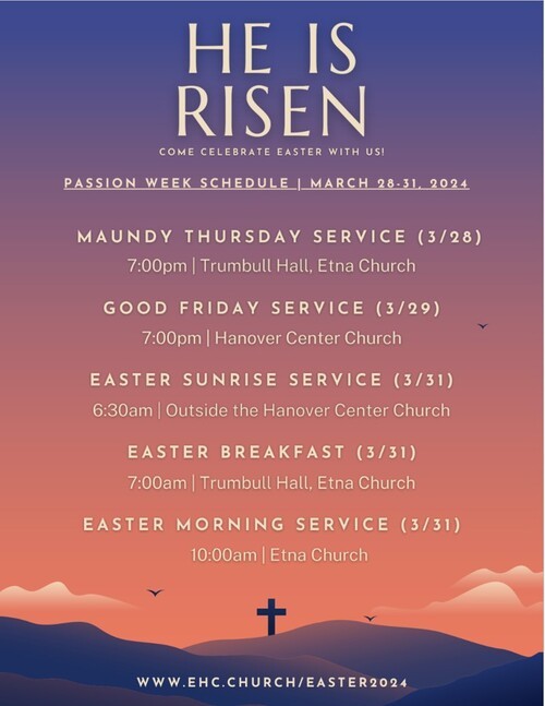 Easter Morning Breakfast - request for muffins, etc. We will once again offer our famous Easter morning breakfast after Sunrise service on March 31. Breakfast will be in Trumbull Hall at the Etna church. We could use your donation of some muffins, pastries, or breakfast breads to add to the menu! Norma Pelton asks anyone who wishes to provide some of these treats to please leave them in the kitchen at Trumbull Hall in Etna any time next Saturday (March 30). Thank you very much for your consideration and for your assistance!