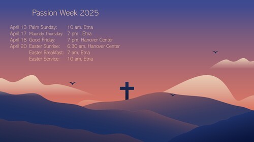 Easter morning Breakfast: One of our church traditions is a full breakfast, starting at about 7:30 am in Etna, just after the Easter Sunrise service (which begins at 6:30 am on Sunday, April 20, in front of the church in Hanover Center). We welcome homemade muffins, sweet breads, breakfast rolls etc. to be shared at the Easter morning breakfast in Trumbull Hall at the Etna church. Please have your baked goods to Trumbull Hall on Saturday, April 19, or by 6 am on Easter Sunday morning. This will allow us time to prepare them for serving. Thank you for your generosity and we look forward to seeing everyone on Easter morning!
